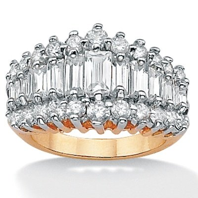 The sparkle never seems to end with this magnificent ring. Rows of exquisite round and baguette-shaped cubic zirconia, 4.38 carats T.W., wrap around your finger with impressive beauty. 18k gold (40 mils) over sterling silver. Sizes 5-10.